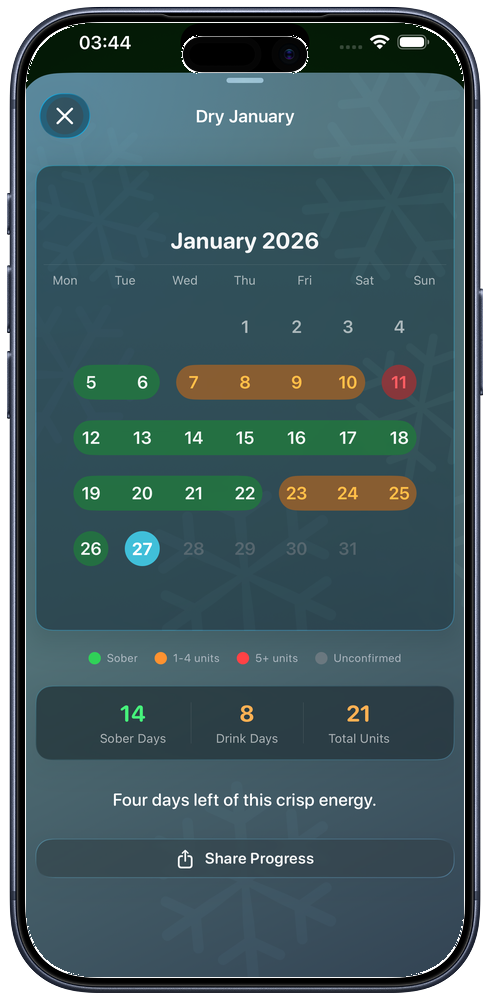 Track your drinking habits by voice. See your patterns, build streaks, join challenges like Dry January and Sober October.